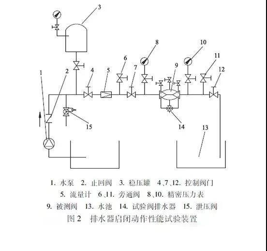 3.2 排水器密封性能试验排水器密封性能试验装置与排水器启闭动作性能试验装置一致。试验时,出口有流量流出,调节被测阀,使出口流量从微流量到额定流量(管中平均流速2m/s),再从额定流量减小到微流量。在整机有流量通过时,排水器在整个试验过程中应密封关闭,无可见渗漏。3.3 防止回流污染功能试验在进口压力小于出口压力时,倒流防止器应能有效的防止回流污染水源。在进口压力小于出口压力时,排水器应能有效开启,使中间腔与大气相通。在止回阀和整机(包含排水器)内动密封件结构应能保证在其密封失效时,所漏介质均应直接流向中间腔或阀外。出水止回阀密封口挂有直径为3.0mm的金属丝时,其最大渗漏流量应符合规定。当渗漏介质流经排水器的流量达到规定时,且中间腔压力不大于10 5KPa时,计量排水器的流出量。3.4 耐久性能试验耐久性能试验装置如图3所示。整机在连续启闭运行试验2万次后,应保持原有的性能。